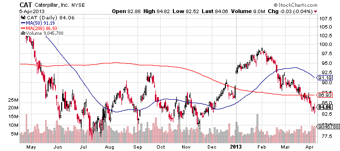 However, look at this chart for Caterpillar (CAT), a large equipment manufacturer. This chart is from the same time period as the previous index charts. The stock topped out in early February and is heading lower.