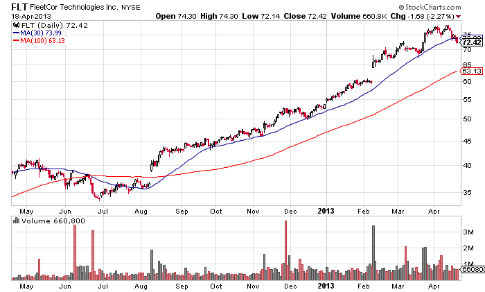 Notice that once FLT broke out in August that it would come back and touch the 30-day moving average every so often, then continue higher. This 30-day moving average provided support for the price on small dips. It also provides areas to purchase the stock if you missed the initial breakout back in August.
