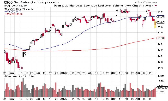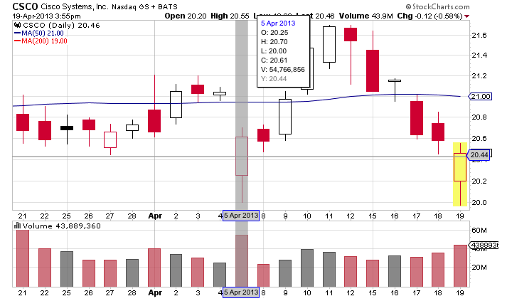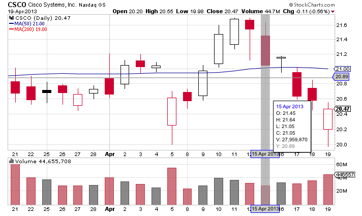Let’s look at a chart of Cisco Systems. The white candles show the price ended higher than the previous day, and red candles show the price ending lower than the previous day.