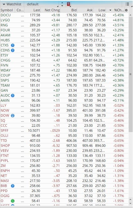 In the following watchlist from TD Ameritrade’s Think Or Swim trading platform, I notice that the stocks in green have been leading the market and tend to be at the top of the list day after day.