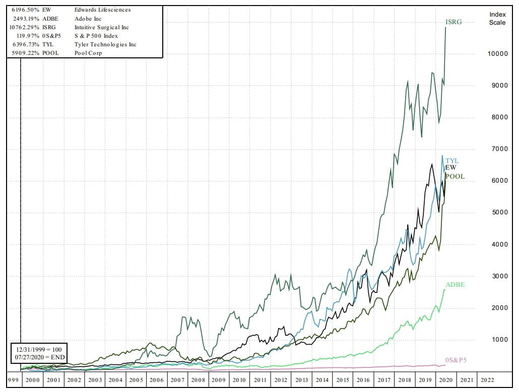 The following chart shows the return of the S&P 500 (in pink) vs. a few LTO stocks like Adobe (ADBE) Pool Corp (POOL), Edwards Lifesciences (EW), Tyler Technologies (TYL), and Intuitive Surgical (ISRG) over the last 20 years.