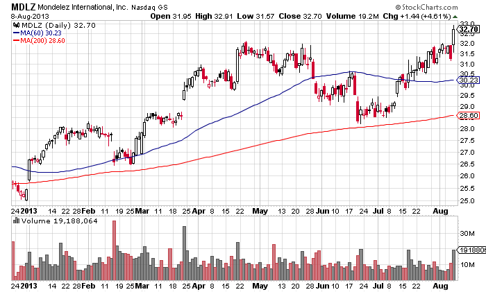 Today my Mondelez stock order was filled at 32.00. The ticker for Mondelez is MDLZ. They reported better than expected income, plus a stock buyback program and dividend increase.