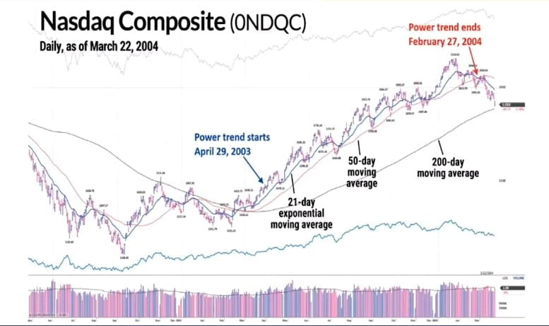 Another example of a Power Trend is from the Nasdaq in 2003-2004.  This Power Trend stayed on for close to a year.  It helped investors stay invested throughout the choppy movements throughout 2003.